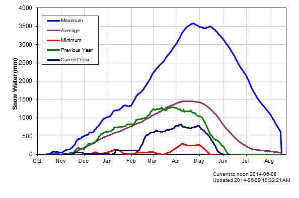 On average, the snowpack usually disappears sometime in July. However, the BC River Forecast Centre shows the snowpack pack effectively disappeared by the end of May, 2 weeks earlier than last year and a full month before it usually does.